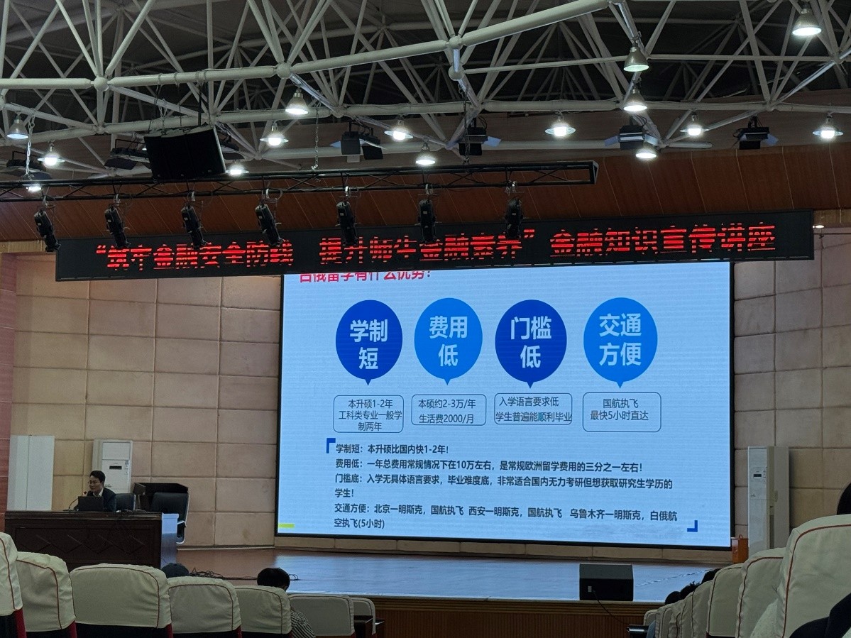 普泽瑞老师围绕“为什么选择留学、白俄罗斯留学有什么优势、留学生回国福利”三个方面进行宣讲。