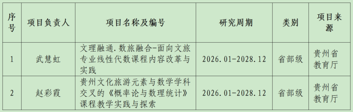 近日,2025 年度贵州省高等教育教学改革研究项目立项名单正式公布,我院数学与应用数学专业喜获两项重要突破 —— 由武慧虹老师主持的《文理融通・数旅融合 —— 面向文旅专业线性代数课程内容改革与实践》,以及赵彩霞老师主持的《贵州文化旅游元素与数学学科交叉的〈概率论与数理统计〉课程教学实践与探索》项目双双获批立项。