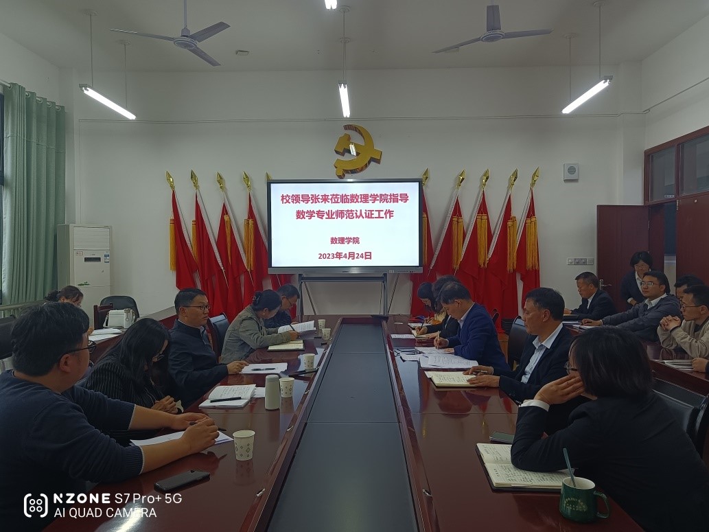 4月24日16:30,张来副校长到我院指导数学与应用数学师范专业认证工作,参加会议的还有教务处彭瑛副处长、质评中心李艺副主任、综合科陈发政科长、评估科李东翔科长。