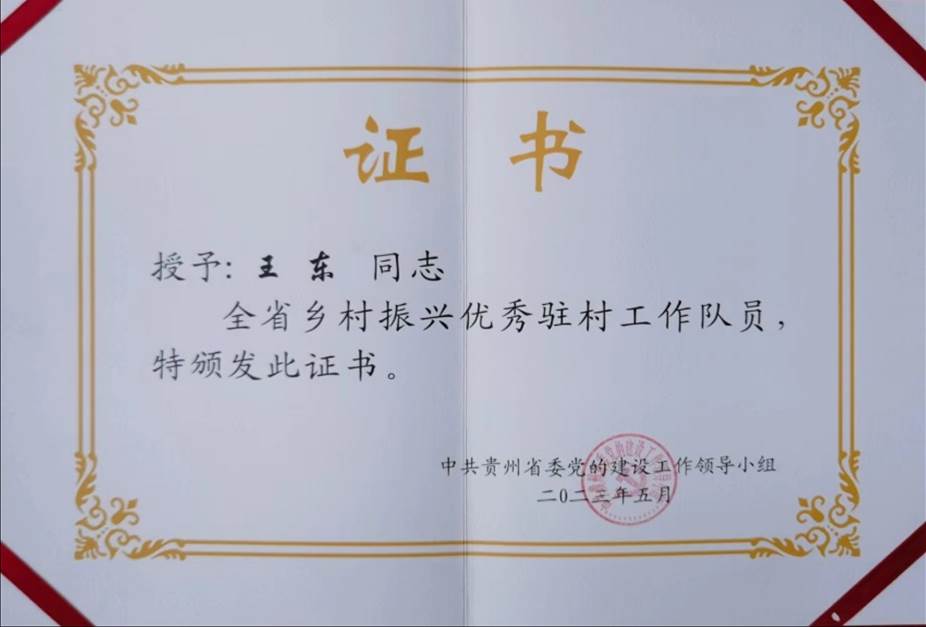 近日,根据“中共贵州省委党的建设工作领导小组关于表彰全省乡村振兴优秀驻村第一书记、全省乡村振兴优秀驻村工作队员和全省乡村振兴驻村帮扶工作先进集体的决定(2023年5月20日)”,我院驻安顺市西秀区七眼桥镇清水屯村工作队员王东同志,被授予“全省乡村振兴优秀驻村工作队员”。