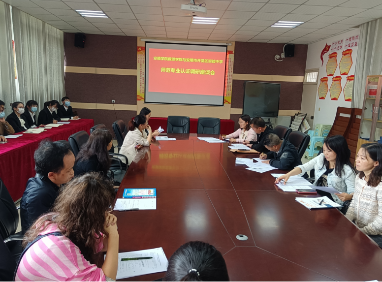 调研采取座谈会和问卷调查的方式进行。会议由实验中学教务处主任王莉主持,校长王登伦出席,陶文艳、杨丹、陈慧敏等数学及相关专业十余名教师代表参加座谈会。与会领导、教师充分交流、讨论了数学与应用数学专业毕业生的市场需求状况,人才规格现实困境,以及人才培养持续改进建议等问题。会议现场还进行问卷调查,收集相关行业专家、数学专业毕业生及用人单位的真实意见及建议,为数学与应用数学师范专业认证奠定坚实的基础,圆满完成调研任务。