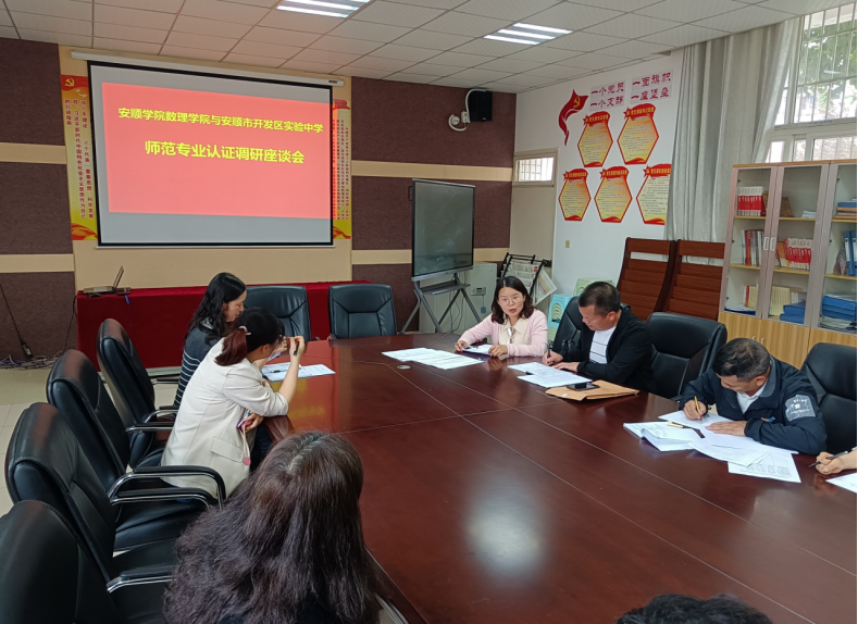 2021年5月31日下午,数理学院党委委员、学生科科长金文琼同志一行三人到安顺市开发区实验中学进行数学与应用数学专业师范认证调研,随行人员有数理学院办公室主任杨勇,学生科工作人员陶从江。
