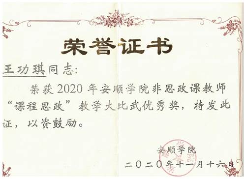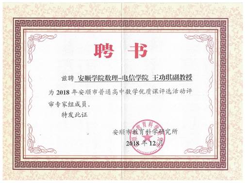王功琪是安顺学院数计学院一名数学教师,自从进校以来,兢兢业业做好本职工作,爱护学生,爱校如家。三尺讲台,一颗爱心。放飞希望,乐此不疲。这就是王功琪老师从师十几年来的真实写照,也是他的执着追求。