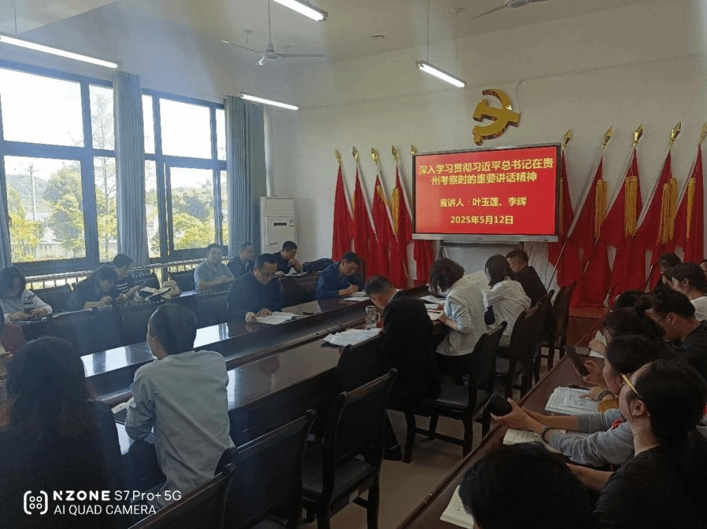 2025年5月12日下午,我院叶玉莲书记和李辉老师在顺理楼2-17会议室,向我院全体教职工开展深入学习贯彻习近平总书记在贵州考察时的重要讲话精神“理论宣传二人讲”。