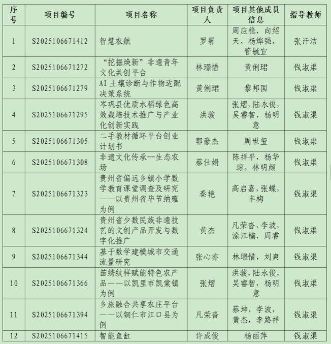 近日,贵州省教育厅正式公布 2025 年大学生创新创业训练计划立项名单,我院学子主持的 12 个项目成功斩获省级立项。