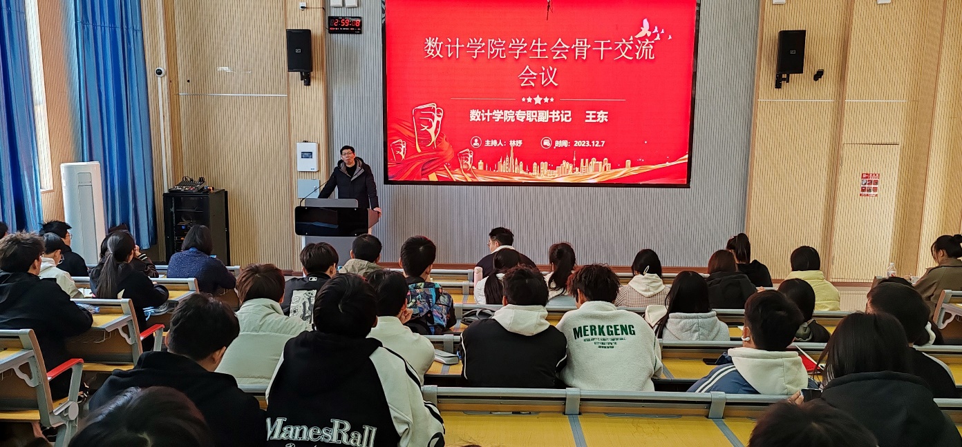 为推进学院团总支、学生会日常工作的开展,进一步增强学生干部的综合能力和服务水平,2023年12月7日下午,我院在顺理楼1-28教室开展团总支、学生会骨干交流会,数计学院专职副书记王东出席会议并对近期工作做安排,会议由团总支副书记林妤主持,团总支、学生会全体成员参加交流。
