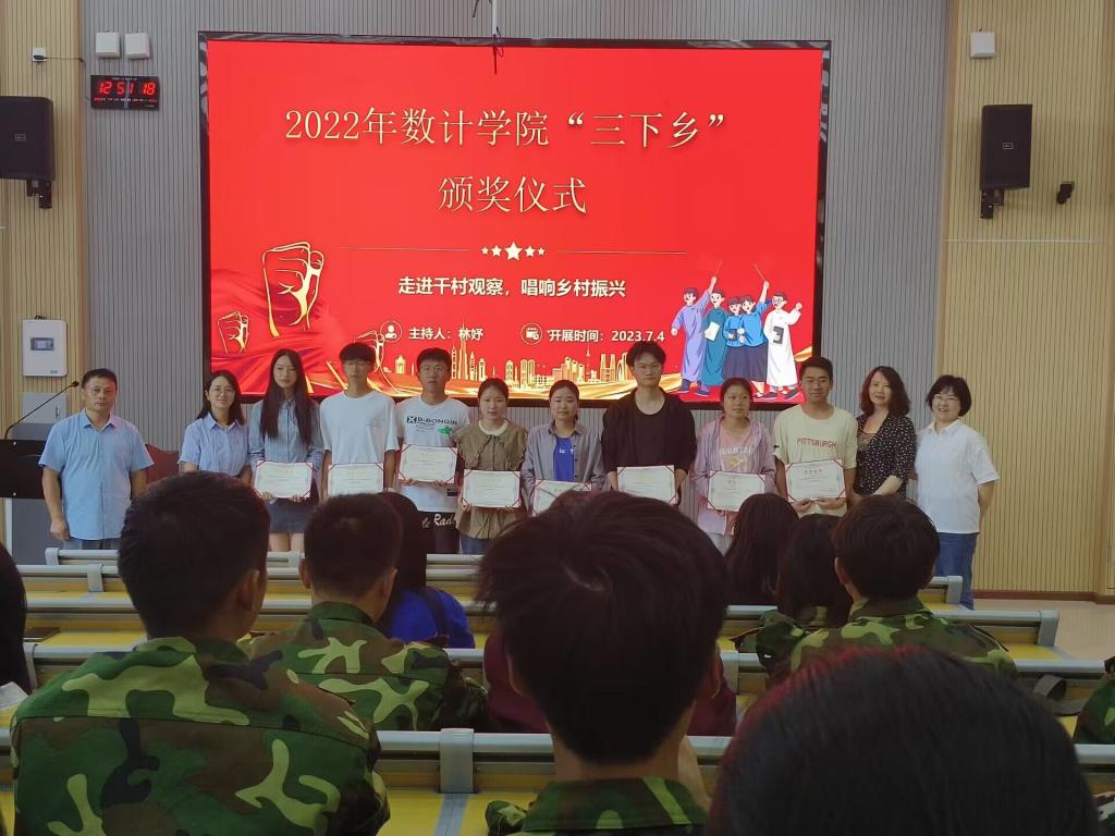 活动由数计学院党委书记叶玉莲为2023年“三下乡”暑期社会实践活动作启动发言,叶书记肯定去年我院社会实践的成效同时对今年参与的同学给予积极的鼓励。随后,李勇书记和谌兰樱主任分别从三下乡社会实践的意义、如何安全活动、鼓励学生们主动了解社会等方面作启动发言。同时,三位领导对去年取得优秀成绩的团队颁发荣誉证书。最后参与活动的人员合影留念,也预示着本次活动的圆满成功。