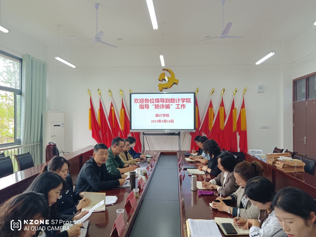 数理学院党委书记叶玉莲对数计学院近期防诈骗工作开展情况进行总体汇报,数理学院李勇副书记和金文琼科长汇报近期防诈骗工作开展的具体情况。