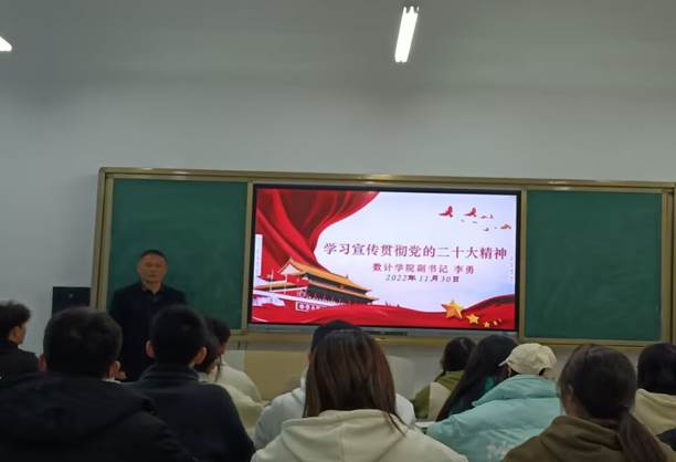 活动伊始,李副书记首先对全体师生进行“党的二十大的主题和主要成果”“党的二十大的主要精神和丰富内涵”进行宣讲,随后结合我院实际进行“以党的二十大精神为指引 推动数计学院高质量发展”主题宣讲。宣讲以数计学院发展历程、取得的成绩以及高质量发展面临的挑战为切入点,利用鲜活详实的案例对与会人员开展宣讲,宣讲活动不仅让全体人员深刻理解了党的二十大精神,还让大家进一步认识到我院在党的二十大召开以后,怎样结合党的二十大精神,积极谋划学院高质量发展有了新的认识,听后让大家精神倍感振奋。