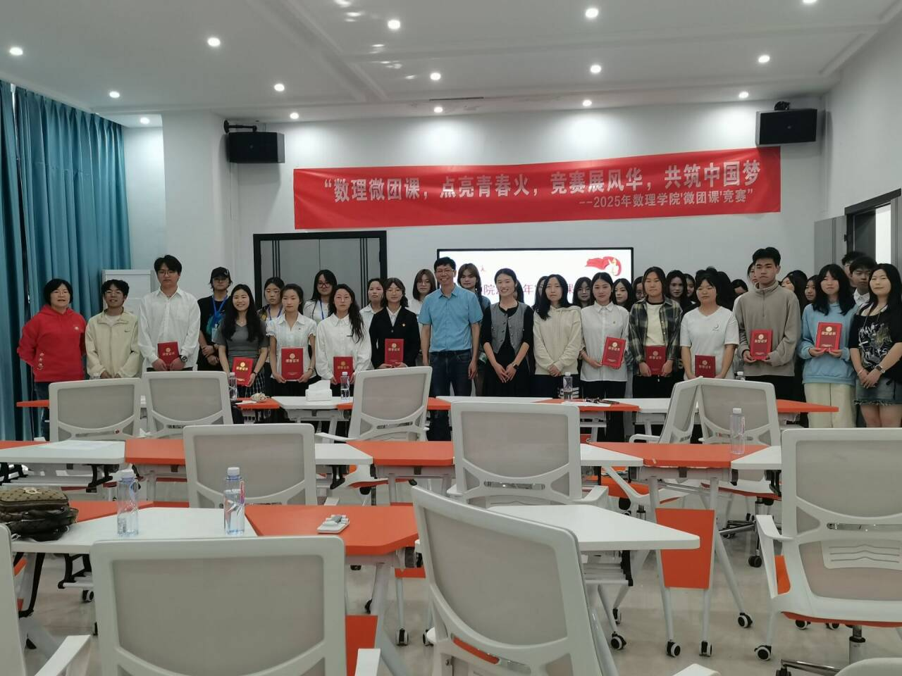 为深入学习贯彻习近平新时代中国特色社会主义思想,引领青年学生厚植爱党爱国爱团情怀,4月 18 日下午,“数理微团课,点亮青春火,竞赛展风华,共筑中国梦”微团课比赛在“一站式”学生社区活动服务中心举行。来自各年级的 10 支参赛团队围绕 “理论学习”“红色传承”“时代使命” 三大主题展开激烈角逐,用青春之声传递信仰力量。