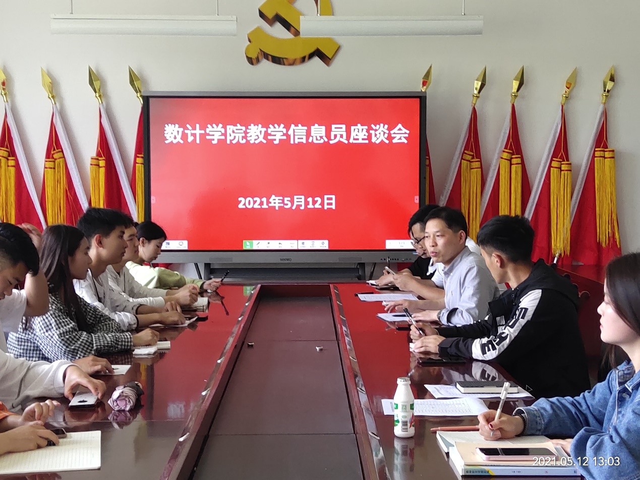 2021年5月12日下午数计学院2021年春季学期教学信息员座谈会在数计学院会议室召开,参加座谈会的有数计学院党委副书记钱淑渠教授、教务科全体工作人员及各班学生教学信息员。