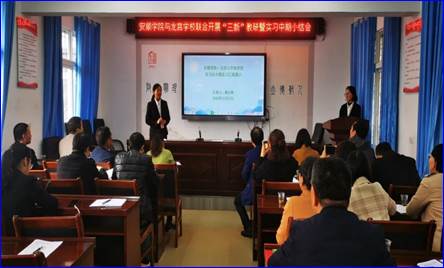 第二阶段是说课评课及实习中期小结汇报,在安顺学院——龙宫九年制学校共建实习实践基地会议室进行。本阶段分五个环节,第一环节是实习生说课,然后进行评课;第二环节是实习生和指导教师分别作实习情况汇报;第三环节是为指导教师颁发聘书;第四环节是安顺学院——龙宫九年制学校共建实习实践基地负责人金松渔老师对近两个月的实习工作进行小结,并对后期的实习工作作出安排;第五环节是我院副院长钱淑渠教授和龙宫九年制学校何仕凯校长分别作总结讲话。