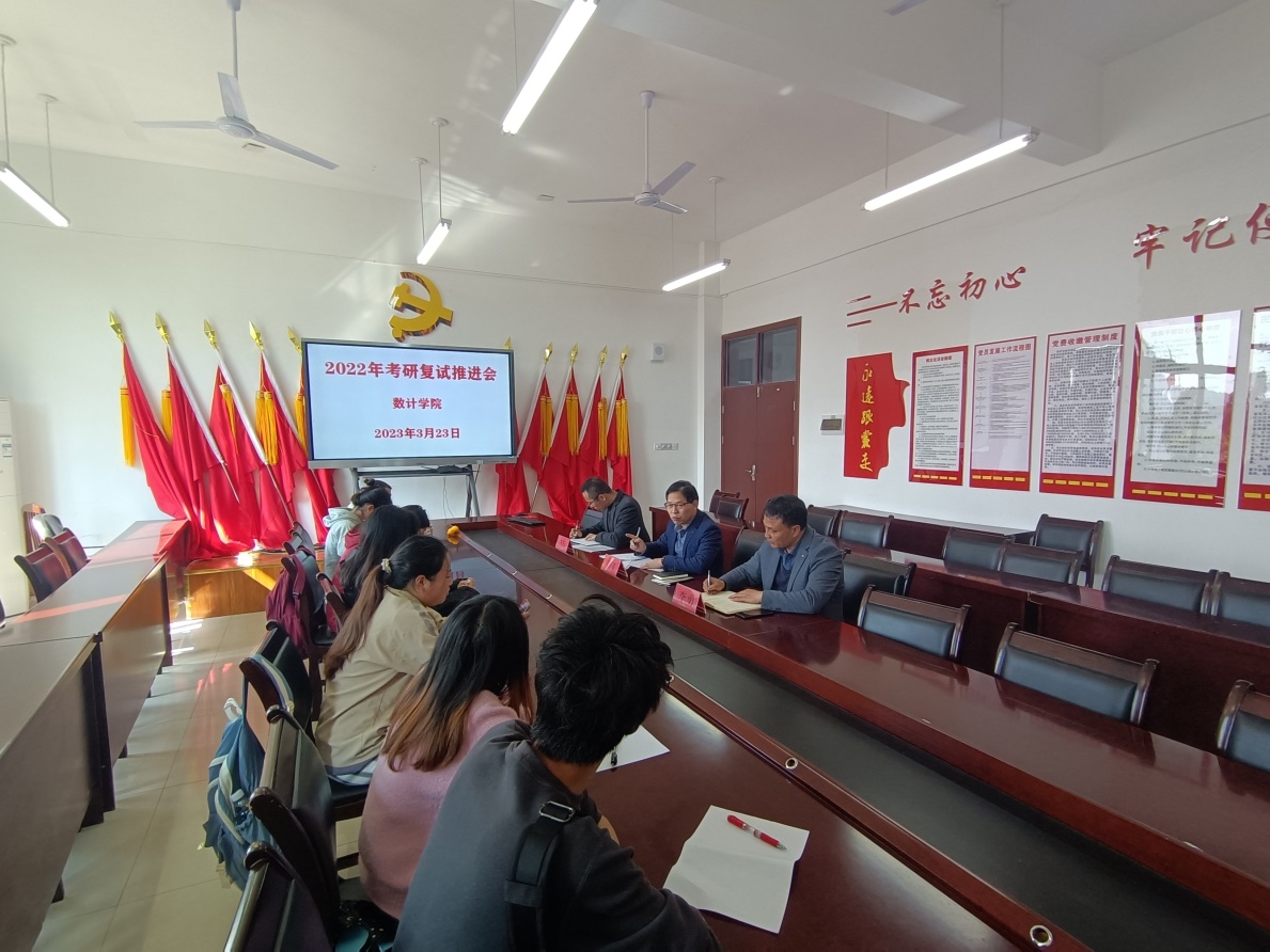 2023年3月23日10:00,我院在顺理楼2-17会议室主持召开2022年考研复试推进会。学院钱淑渠院长、李勇副书记、考研负责人李辉博士及2022年考研上线学生徐佳慧、肖飞、付蝶、龙垚如、赵庭、张露露、周梦、杨丹参加本次会议。
