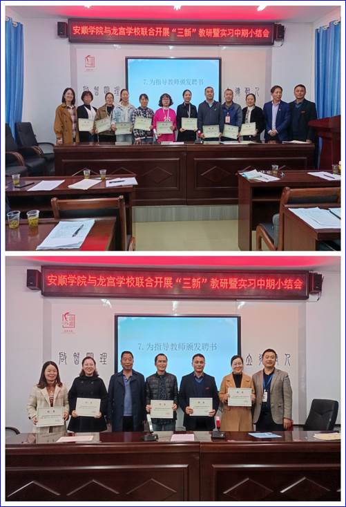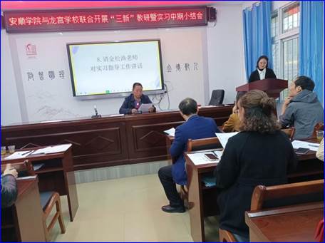 第二阶段是说课评课及实习中期小结汇报,在安顺学院——龙宫九年制学校共建实习实践基地会议室进行。本阶段分五个环节,第一环节是实习生说课,然后进行评课;第二环节是实习生和指导教师分别作实习情况汇报;第三环节是为指导教师颁发聘书;第四环节是安顺学院——龙宫九年制学校共建实习实践基地负责人金松渔老师对近两个月的实习工作进行小结,并对后期的实习工作作出安排;第五环节是我院副院长钱淑渠教授和龙宫九年制学校何仕凯校长分别作总结讲话。